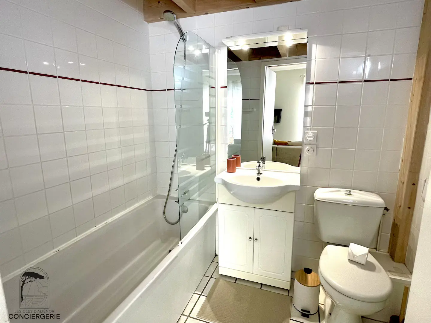 Au rez-de-chaussée : cuisine équipée avec plaque de cuisson induction, four micro-ondes, grand réfrigérateur avec congélateur, lave-vaisselle, bouilloire électrique, cafetière classique à filtre, machine à café Nespresso avec mousseur à lait, grille-pain et vaisselle complète. Coin séjour avec canapé en velours côtelé, table basse et TV écran plat 32 pouces avec Chromecast. Coin salle à manger avec table pouvant accueillir 6 personnes. Salle de bain avec baignoire, meuble vasque et toilettes. Une chambre avec deux lits de 80x200 (convertibles en 160x200), table de chevet, grand miroir et portant à vêtements. À l'étage : une chambre équipée d'un lit de 140x190, et une mezzanine avec banquette de lecture convertible en lit 1 place (170x107). Extérieurs : terrasse privative avec table et chaises de jardin en teck. La résidence dispose d'une belle esplanade végétale où les enfants peuvent jouer en sécurité, d'une piscine intérieure chauffée ouverte toute l'année et d'une piscine extérieure ouverte d'avril à septembre. Plage accessible à 10 minutes à pied. Laverie disponible dans la résidence (5€/machine, 2€/90min de sèche-linge).